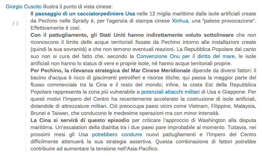 Il mio commento per Limes riguardo l’ingresso del cacciatorpediniere Usa all’interno delle 12 miglia marittime delle isole artificiali costruite dalla Cina nel Mar Cinese Meridionale.