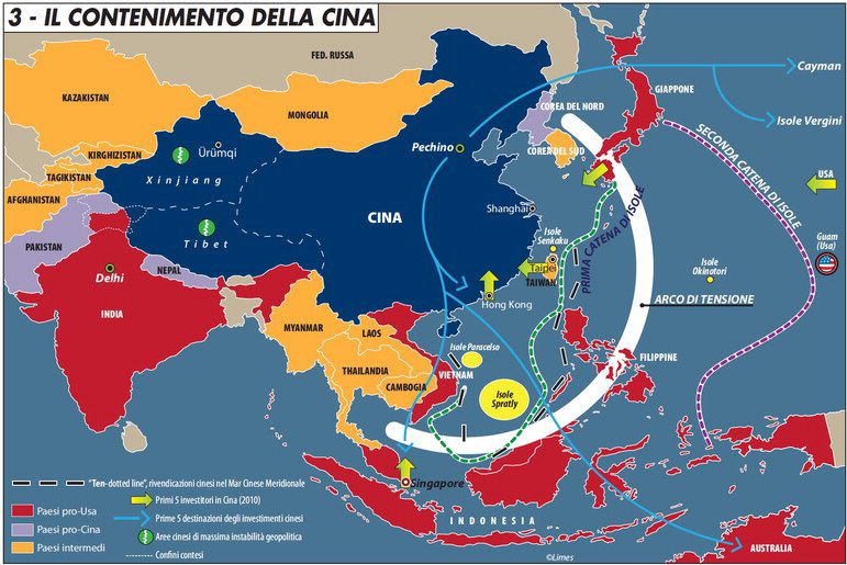Il governo cinese inoltre teme che gli USA e i loro alleati in Asia-Pacifico (Corea del Sud, Taiwan, Filippine e Giappone) possano in futuro ostacolare i flussi commerciali da e per la RPC che solcano questi mari. Le forze armate di Tokyo hanno al momento solo funzione di autodifesa, ma il Premier nipponico Shinzo Abe vuole rimuovere tale limite entro il 2020. Ciò, insieme alla contesa per le isole Diaoyu/Senkaku, alimenta la tensione tra Giappone e RPC e potrebbe ulteriormente incoraggiare la strategia americana del Pivot to Asia, formulata proprio per contenere l’ascesa militare ed economica della Cina.